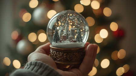 Hand holding a snow globe against blurred Christmas tree with lights.