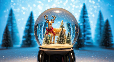 Enchanting winter wonderland: deer inside sparkling snow globe with festive background.