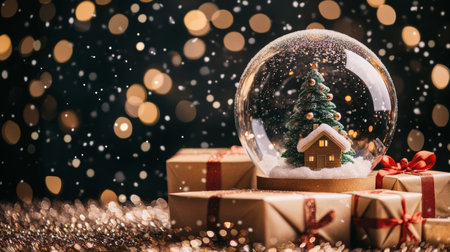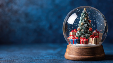 A snow globe features a miniature Christmas tree and wrapped presents, set on a wooden base. The scene is enclosed within a glass sphere, with simulated snowflakes. The image showcases a vibrant color palette and is lit by natural light, suitable for festive concepts and holiday-themed designs.