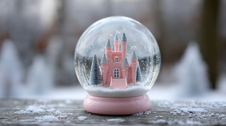 A charming snow globe featuring a pink castle surrounded by snowy trees, evoking a magical winter atmosphere perfect for seasonal decor.