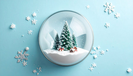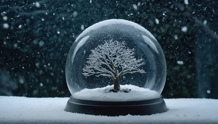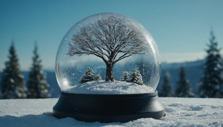 An AI generated illustration of A decorative snow globe featuring a tree in a wintery wonderland scene beneath a blue sky
