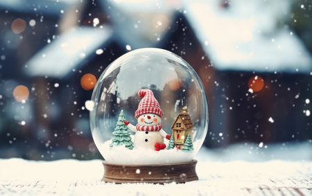 A snowstorm is present while a snowman is depicted in a glass Christmas globe. Christmas snow globe. Generative AI art