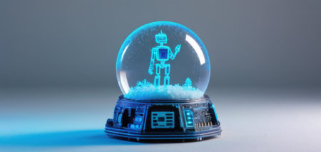 glowing robot in a digital snow globe with blue light on grey background christmas concept