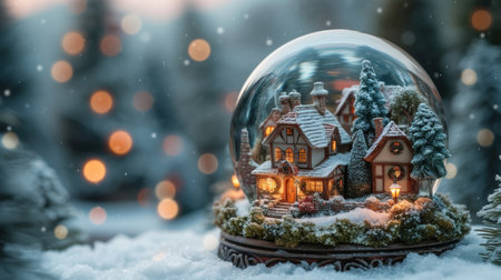 A detailed snow globe captures a cozy village scene with festive lights and falling snow, set against a serene winter landscape