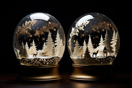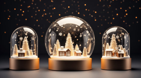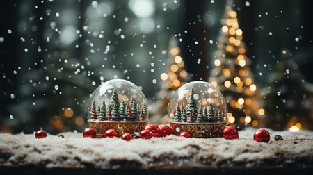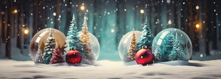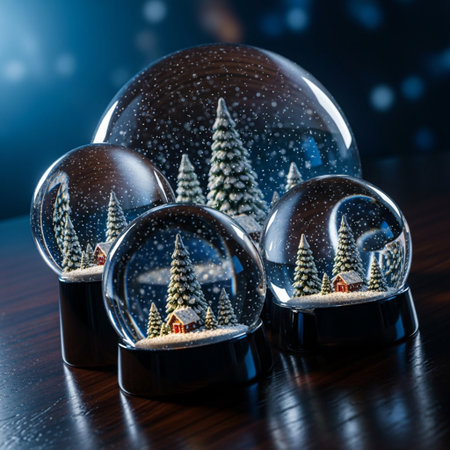 A captivating winter scene showcases illuminated snow globes filled with intricate snowflakes and pine trees, creating a magical holiday atmosphere.