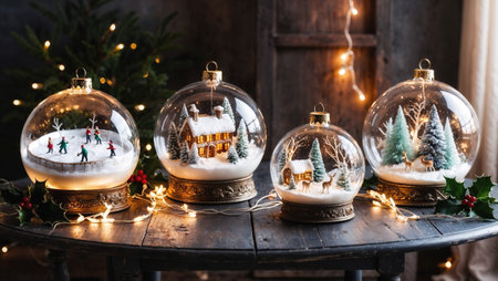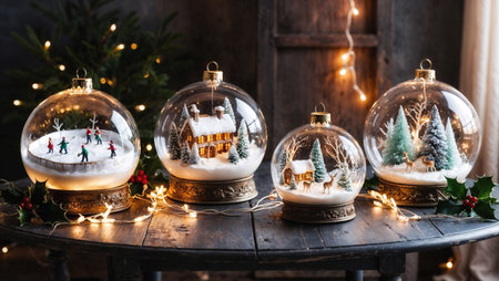 Four illuminated snow globes with miniature winter scenes rest on a wooden table decorated for Christmas