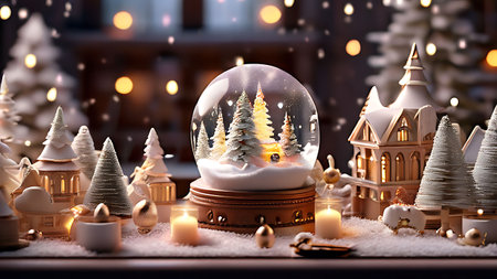 Enchanting Christmas snow globe featuring a miniature winter village with snow-covered trees, cozy houses, and warm candles, creating a festive and serene atmosphere.