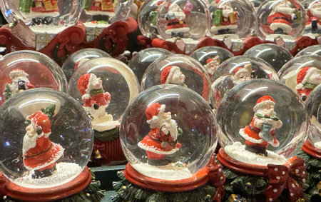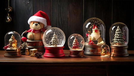 Festive santa claus snow globes collection with christmas decorations.