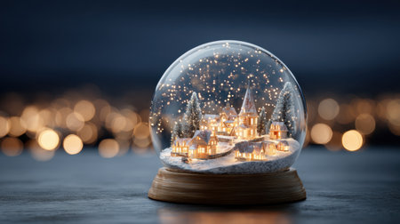 A whimsical snow globe encases a quaint town, dusted with snow, capturing the magic of winter with twinkling lights.