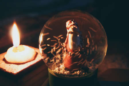 Snowy glass ball with Santa Claus inside, next to which a candle is burning