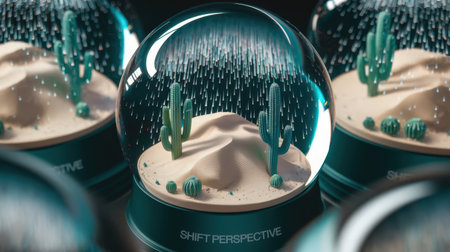 Close-up of miniature desert landscape with cacti inside a snow globe featuring the text Shift Perspective on the base, creative concept.
