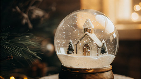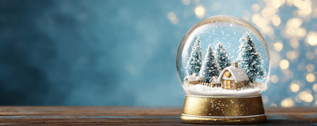 Snow globe with snowy cottage and pine tree scene glowing warmly on wooden table in soft winter bokeh light
