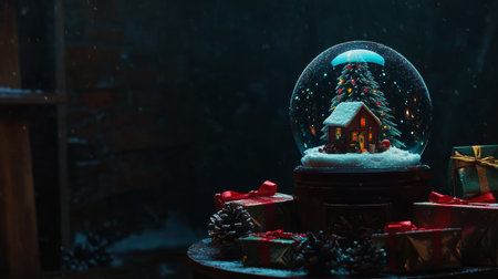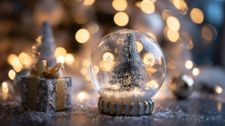 A Christmas tree is surrounded by a glass ball filled with snow and a gold wrapped gift box. The scene is lit up with a warm glow, creating a cozy and festive atmosphere