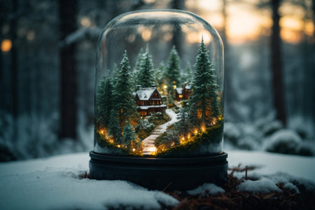 Snow globe featuring a glowing winter forest scene, beautifully lit with warm ambient lights