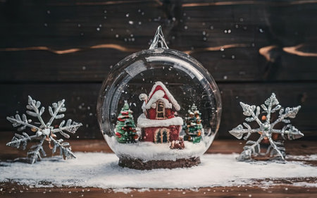 A charming snow globe featuring a cozy house, surrounded by swirling snowflakes, evoking a festive winter wonderland.