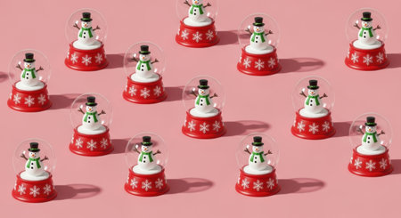 A repeating pattern of charming snowman snow globes with red bases and black hats, set against a vibrant pink backdrop.