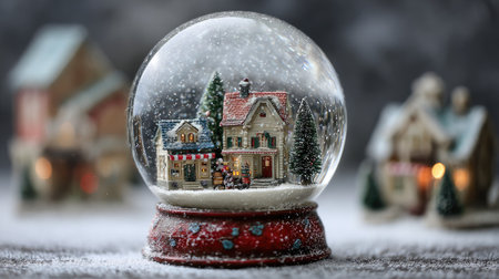 A snow globe features miniature houses, trees, and falling snow, creating a festive scene. The composition highlights a central snow globe with a red base and several houses. The soft lighting and blurred background suggest a tranquil winter setting. This image is suitable for commercial uses, including seasonal decorations or holiday-themed projects.