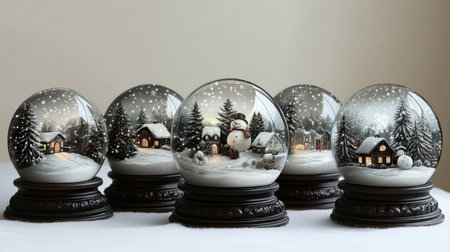 Five intricate snow globes depict cozy winter village scenes with snow-covered houses, trees, and cheerful snowmen, creating a festive atmosphere filled with holiday spirit and wonder.