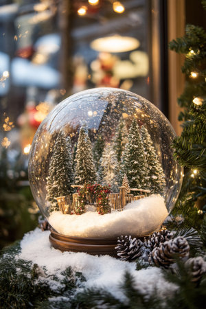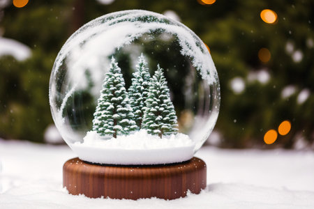 A stunning close-up of a snow globe featuring beautiful pine trees and delicate snowflakes, surrounded by festive ornaments and glimmering lights for a magical holiday atmosphere.