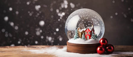 Winter season. Beautiful snow globe with snowy landscape, winter home castle and trees on a Christmas themed background copy space