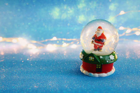 Image of christmas snow glass ball with santa claus in front of glitter blue background