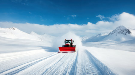 A bright red snow plow traverses a snow-covered road in a stunning alpine scene, showcasing nature's winter beauty amid majestic mountains and clear skies.