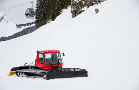 Red snowcat parked under ski lift in ski resort Sljeme near Zagreb, Croatia.