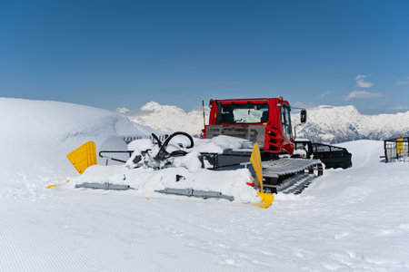 Red modern snowcat ratrack with snowplow snow grooming machine preparing ski slope piste hill at alpine skiing winter resort Ischgl in Austria. Heavy machinery mountain equipment track vehicle.