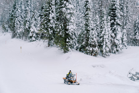 Man in a yellow ski suit rides a snowmobile through a snowy forest at the foot of a hill