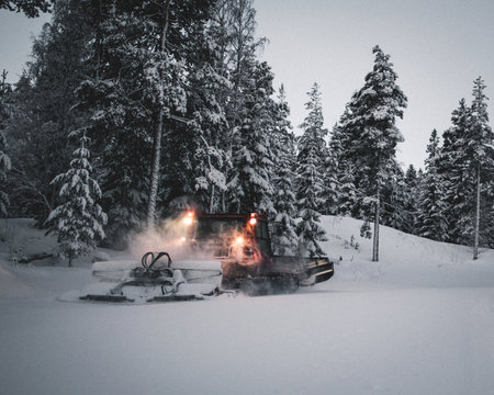 snow grooming machine at work smoothing out ski slope for skiing