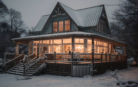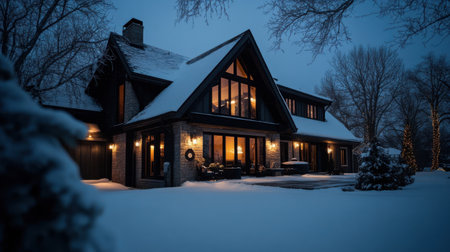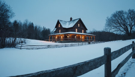 A cozy wooden farmhouse glows with warm interior lights at dusk, set against a serene, snow-covered landscape with silhouetted trees.
