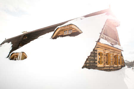 Beautiful wooden cottage covered in snow, ski resort Donovaly, Slovakia