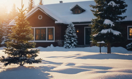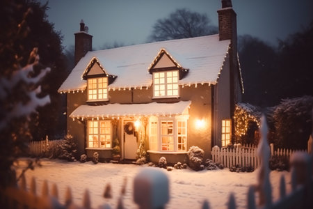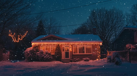 A cozy house adorned with glowing holiday lights under falling snow on a serene winter evening. The scene captures festive tranquility and warmth.