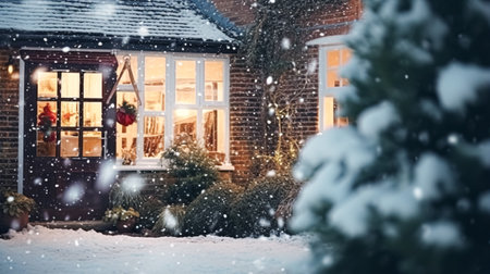 Christmas in the countryside, cottage and garden decorated for holidays on a snowy winter evening with snow and holiday lights, English country styling inspiration