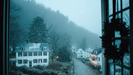 A view of houses and a road nestled in a valley is seen through a window. The scene is overcast with a muted color palette dominated by whites, grays, and greens. The image features architectural details and a hint of a wreath. This image could be used for various commercial or editorial purposes.