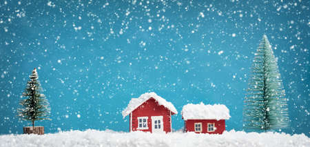 Merry Christmas and 2024 happy new year horizontal banner with small toy model house on winter snow background. Miniature white toy house model. High quality photo