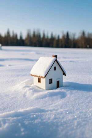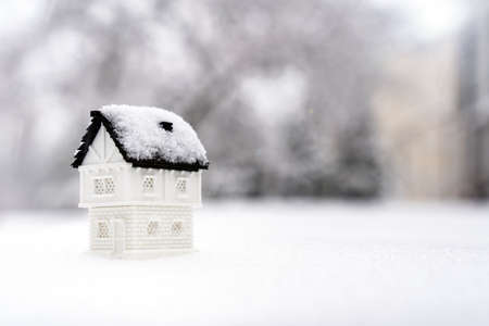 Miniature 3D model house on snow for winter season, real estate, property or rental market