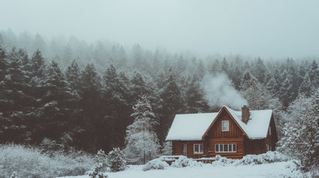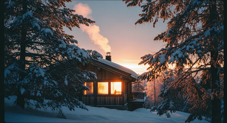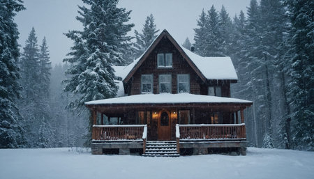 Cozy cabin in the forest surrounded by snow, representing winter travel and tourism
