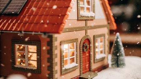 Cozy winter cottage with snowfall and warm lights in festive holiday scene.