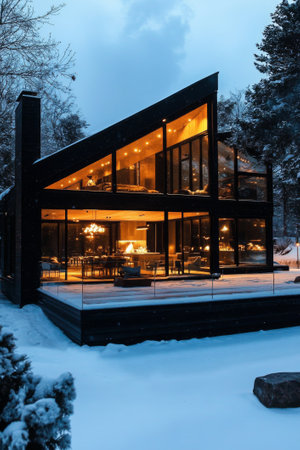 Modern house with panoramic windows in a Winter forest on the lake shore.