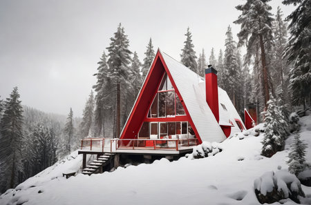 Exterior view of a scandinavian chalet covered by snow in middle of forest created using generative AI technology