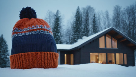 An orange and blue knitted winter hat sits in the snow, with a modern dark house and illuminated windows in the background.
