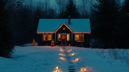 A charming winter cabin adorned with festive lights, nestled in a serene snow-covered landscape. The inviting pathway and surrounding trees create a magical nighttime atmosphere.