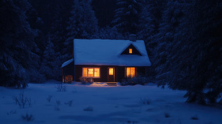 A cozy cabin stands in a snowy landscape at night, its glowing windows inviting warmth amid the chill. Tall trees surround the peaceful scene, providing a tranquil escape.