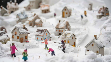 A miniature winter village scene is set up with small, white houses covered in snow. Tiny figures are playing in the snow around the houses. The houses are lit up with warm, glowing windows and the scene creates a whimsical and charming atmosphere.