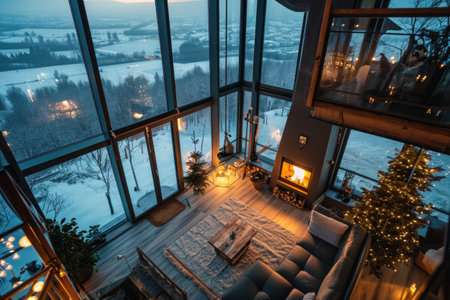 Interior of cozy house with fireplace and Christmas tree in Scandinavian style.