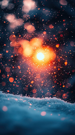 A close-up view of warm, glowing golden and red bokeh lights interspersed with falling snow against a dark blue...