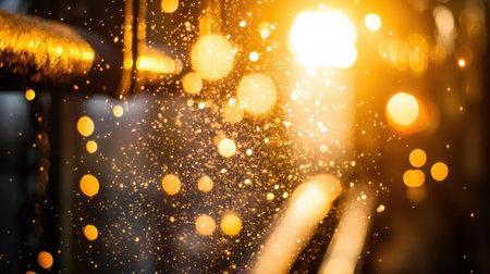 Close-up, dreamy shot of bright, golden sparks and soft bokeh lights, like a festive garland