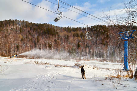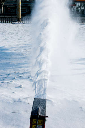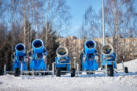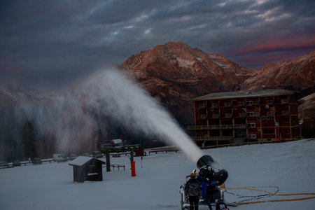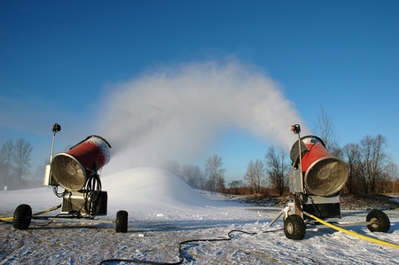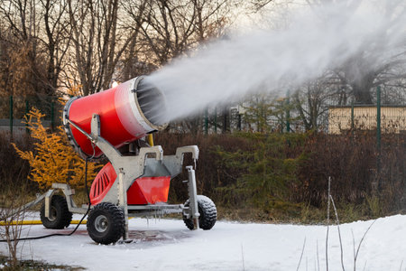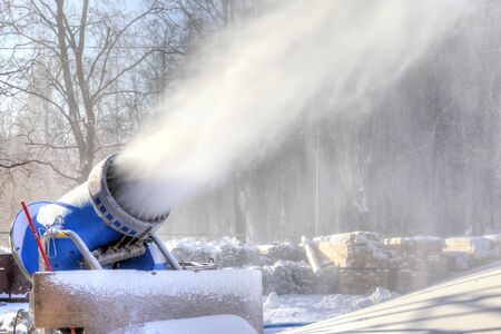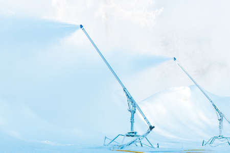 professional artificial snow machine cannon making snowflakes from water at ski resort