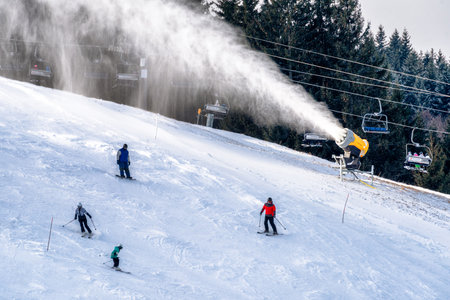 Ruzomberok, Slovakia - December 30, 2025: Snowmaking machine producing artificial snow on ski slope at Malino Brdo ski resort while skiers descend, showing winter tourism, slope maintenance and active ski operations.